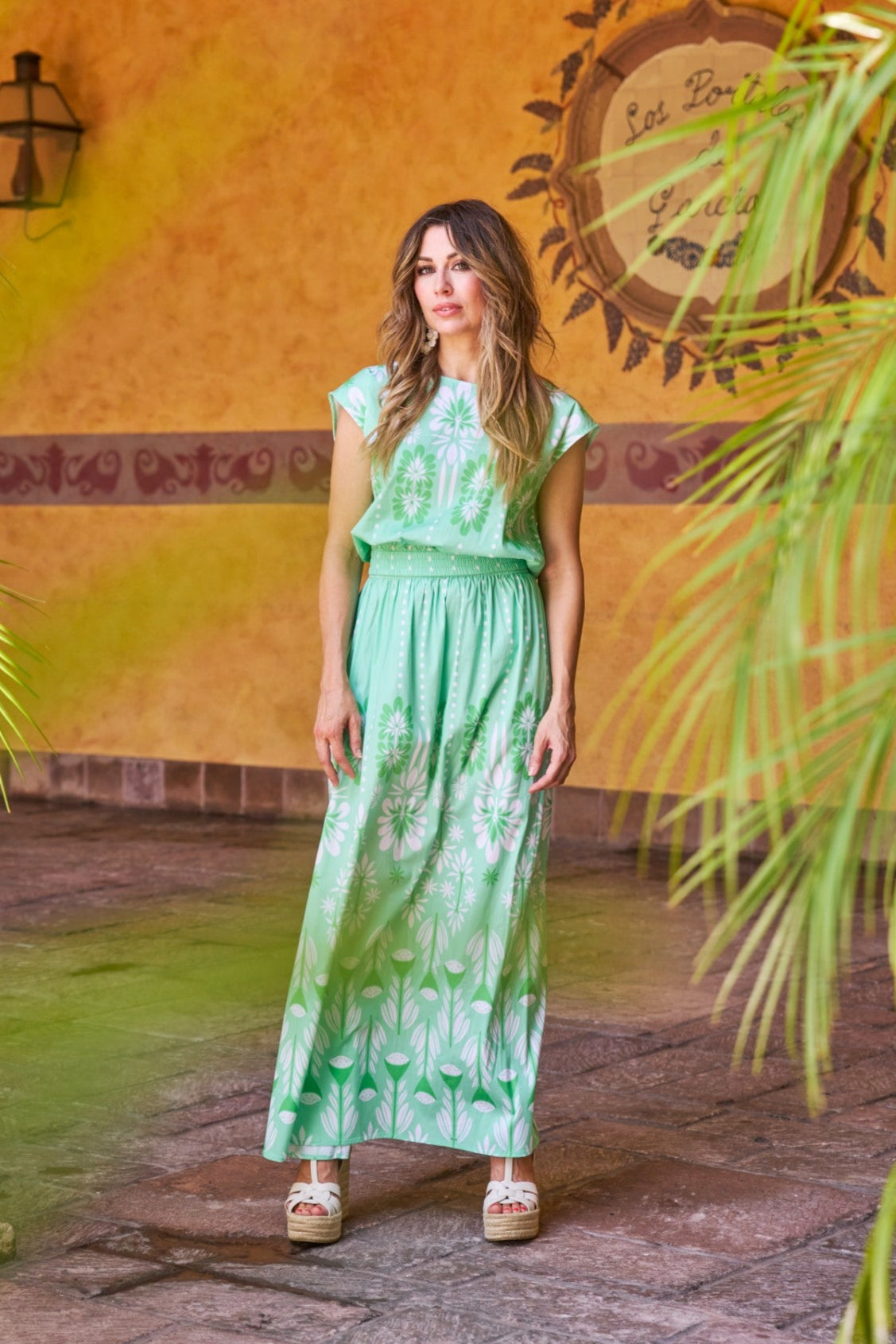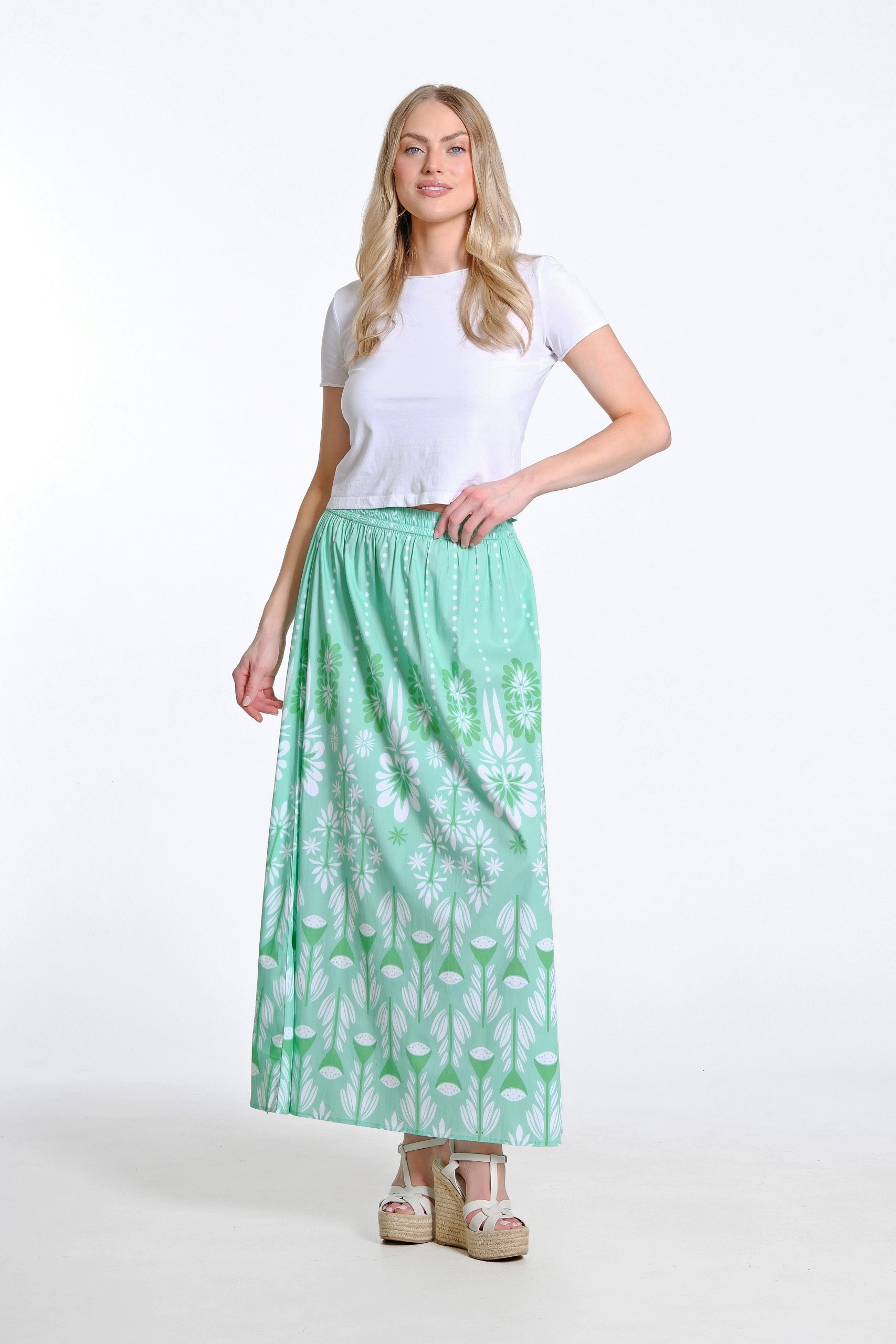 Romantic femininity blooms in our Gardenia Skirt in Mojito Summer. Fitted at the waist, this skirt adds a refreshing pop of color, perfect for warm-weather days. Whether worn on its own or paired with the matching blouse, it’s a go-to for any summer outing and pairs effortlessly with sandals for a chic, laid-back look.